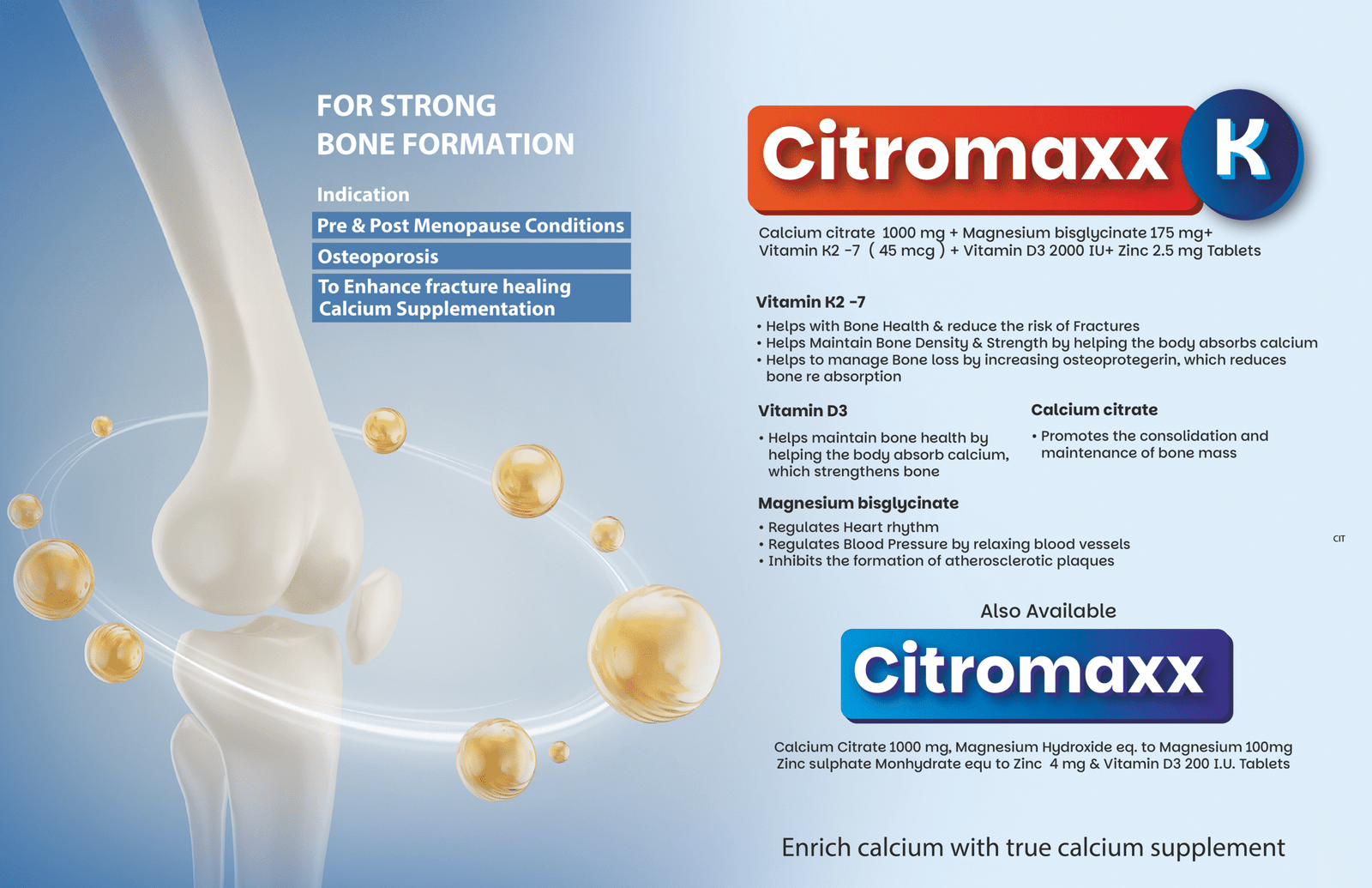 Calcium citrate 1000 mg + Magnesium bisglycinate 175 mg+ Vitamin K2 -7 ( 45 mcg ) + Vitamin D3 2000 IU+ Zinc 2.5 mg Tablets